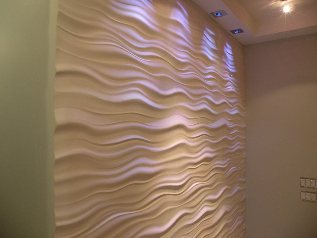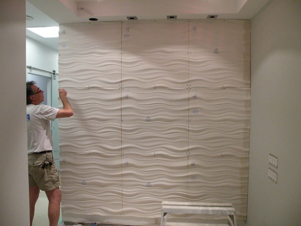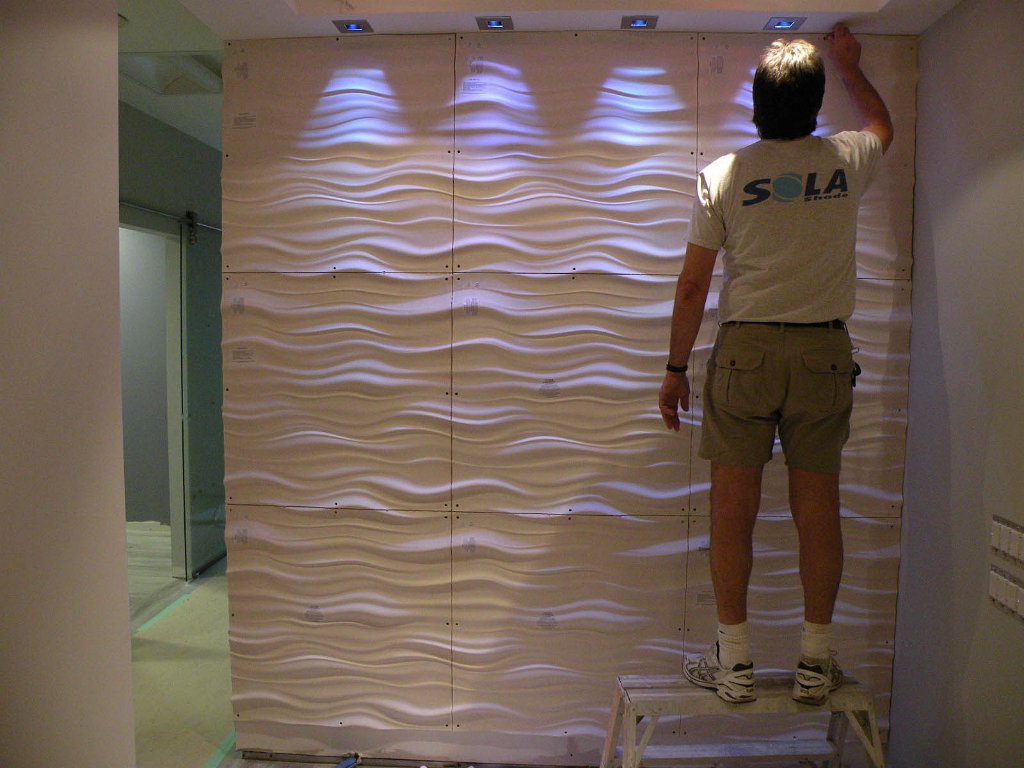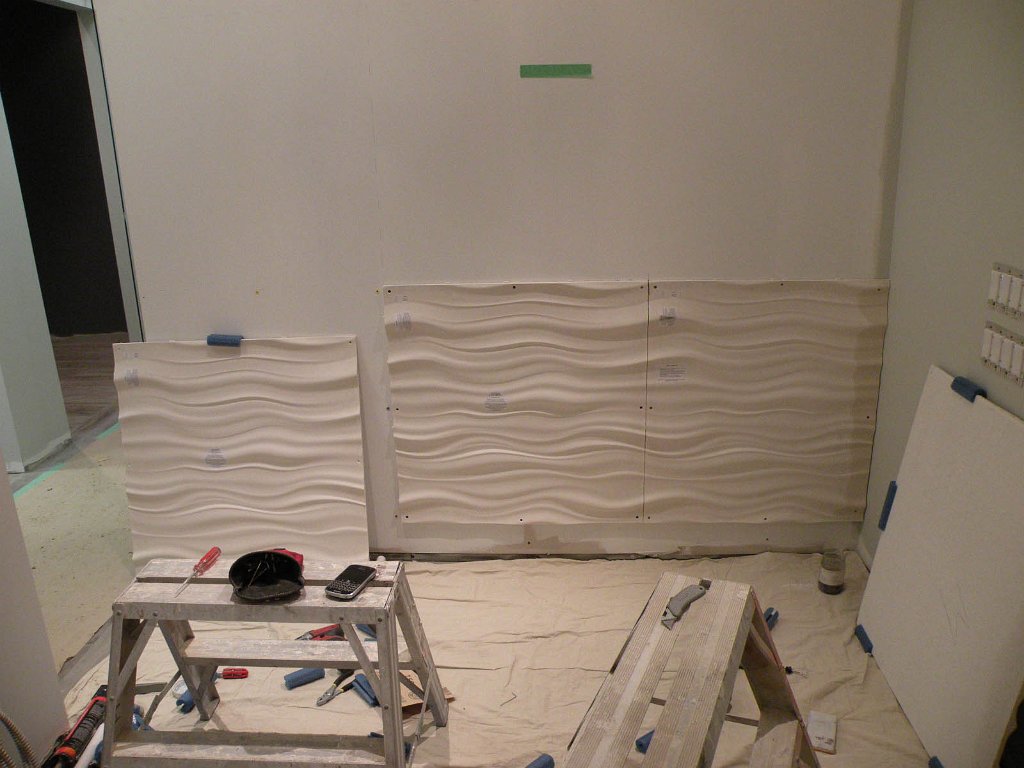 14We affixed these oversized wave panel tiles to the reception wall of the office